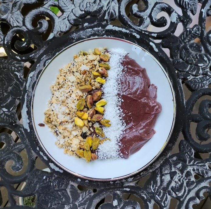 Acai and blueberries offer powerful antioxidants that combat oxidative stress and inflammation, while pineapple and sweet potato boost your intake of vitamins C and A, supporting immune function and skin health. The fiber from sweet potato, blueberries, and granola aids digestion and helps keep you full, while the healthy fats from coconut milk and pistachios promote heart health and provide lasting energy. Additionally, the collagen powder contributes to skin elasticity and joint health, making this bowl a tasty, nutrient-dense choice.