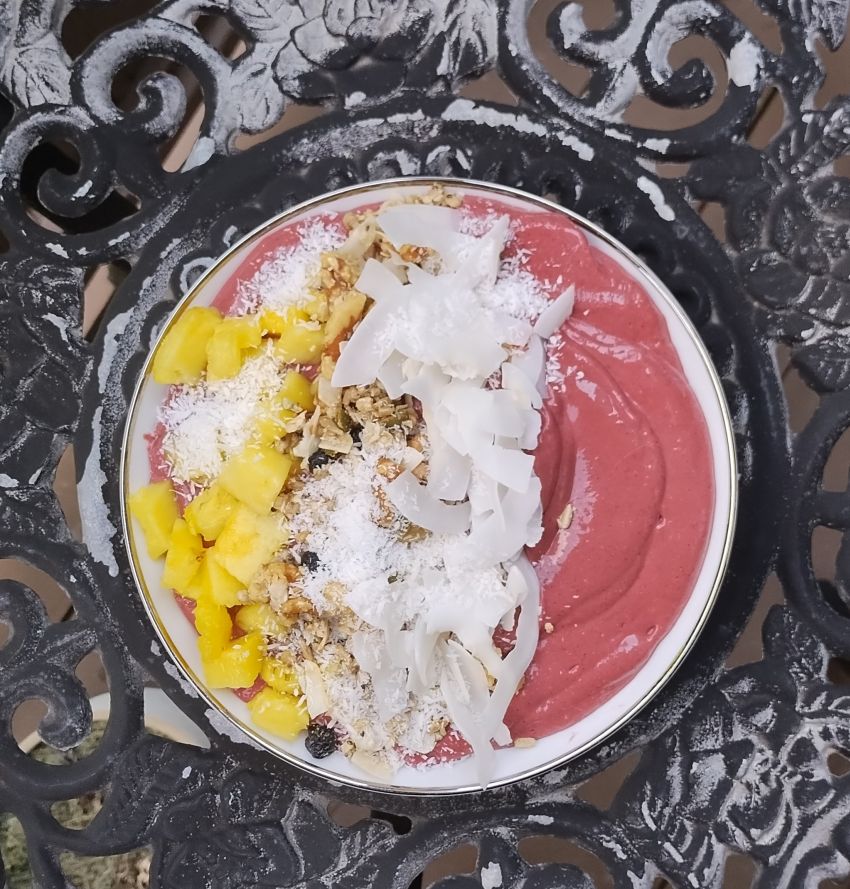 - Serve: Pour the smoothie mixture into a bowl and top with your favorite fresh fruits, granola, and coconut.